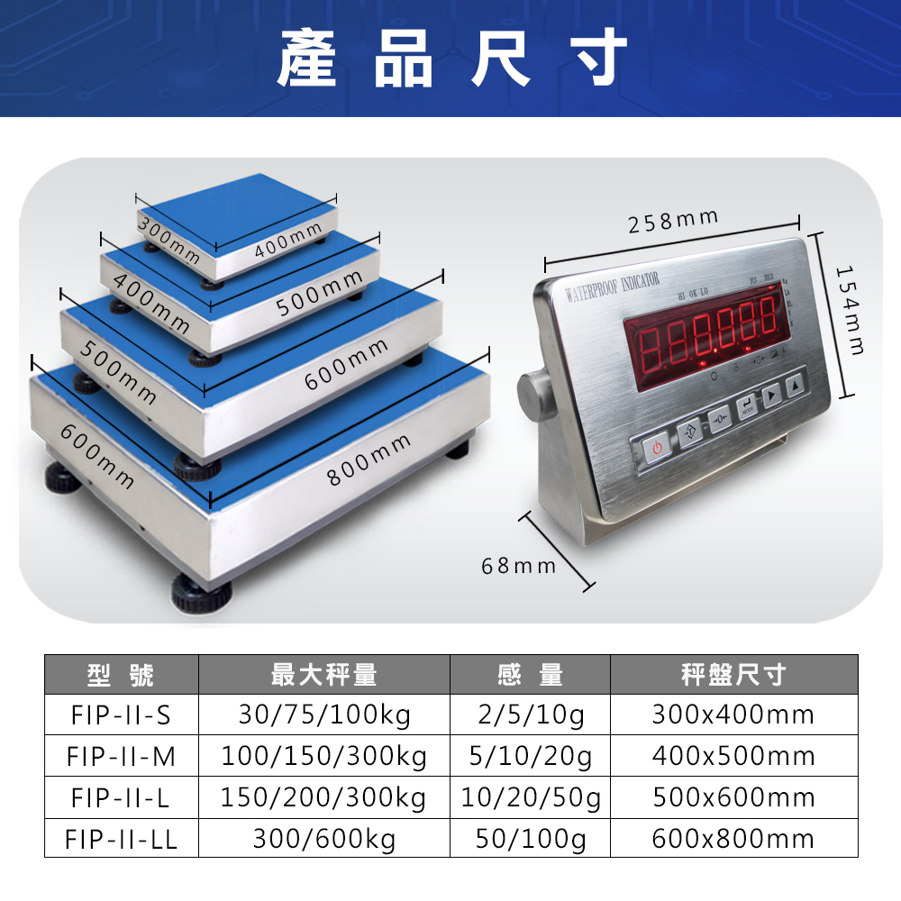 | FIP-II-L | 150/200/300kg | 10/20/50g | 500x600mm |