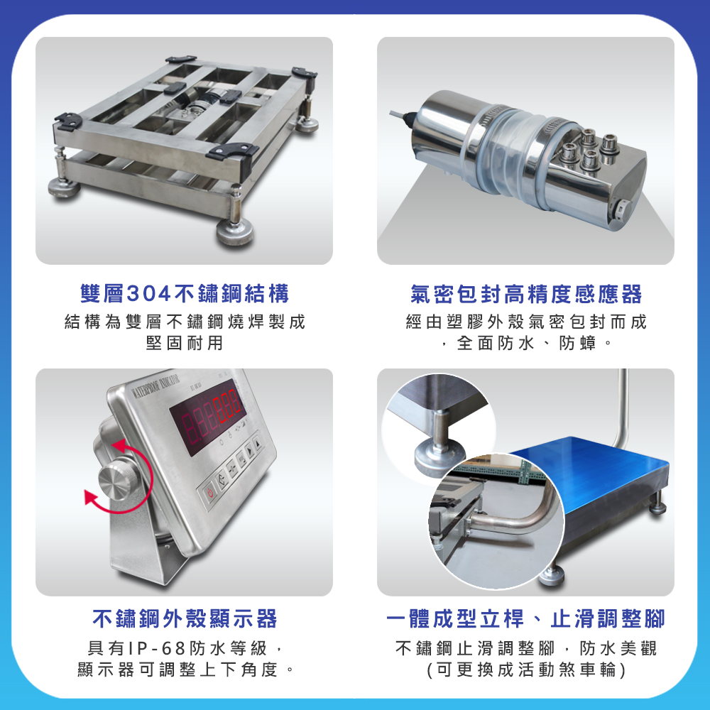 - 秤台表面採用ㄇ型不鏽鋼鋼板,秤盤高度下拉包覆整台邊緣結構,保護內部結構不容易進水、防塵、不易變形。