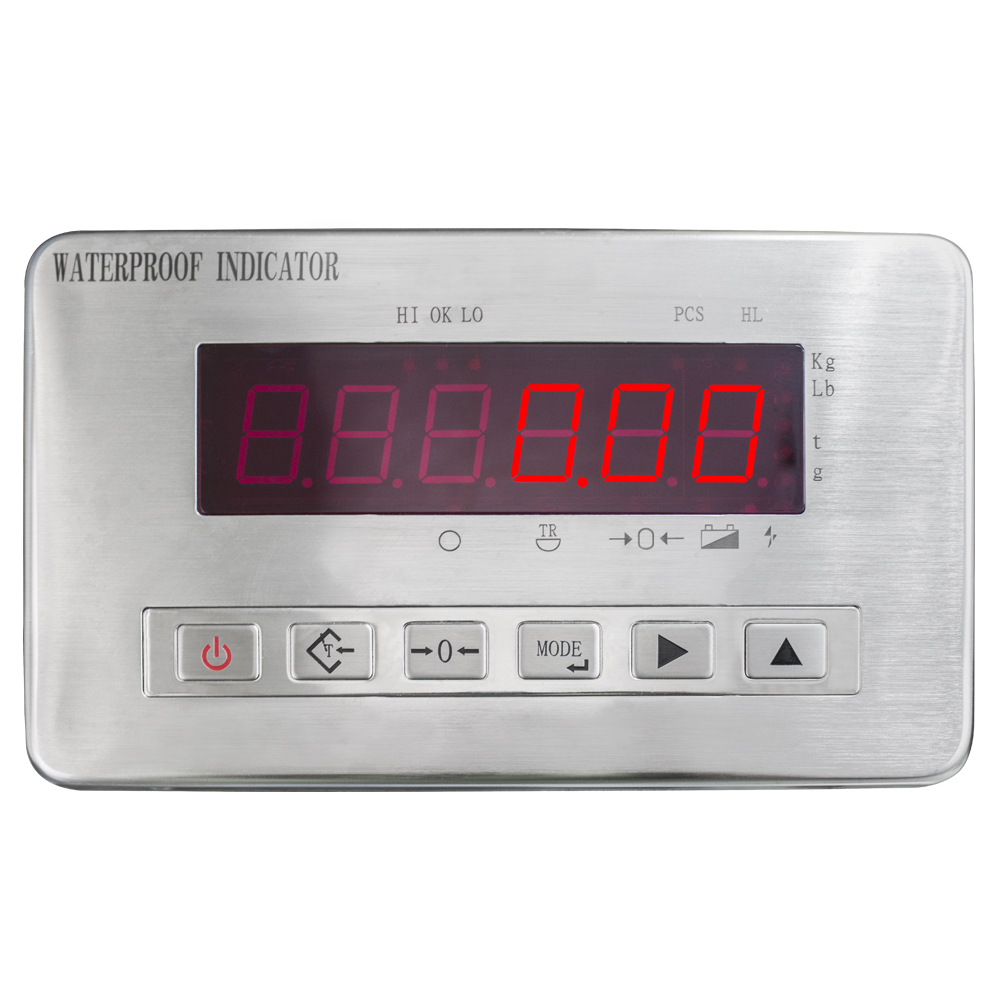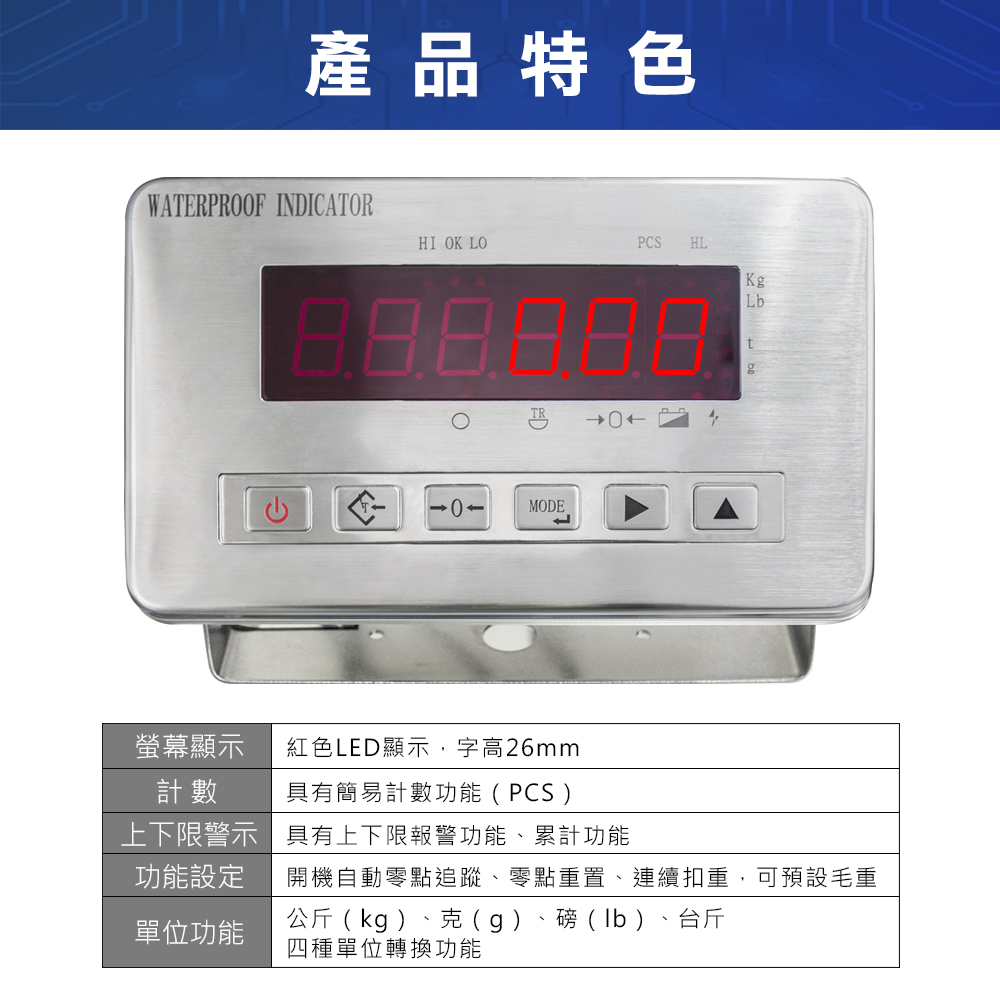 不鏽鋼顯示器按鍵及外殼全部為不锈鋼製成,符合IP-68防水防塵等級,使用紅色LED顯示,字高26mm,顯示頭可調整上下角度, 晰明亮易讀。