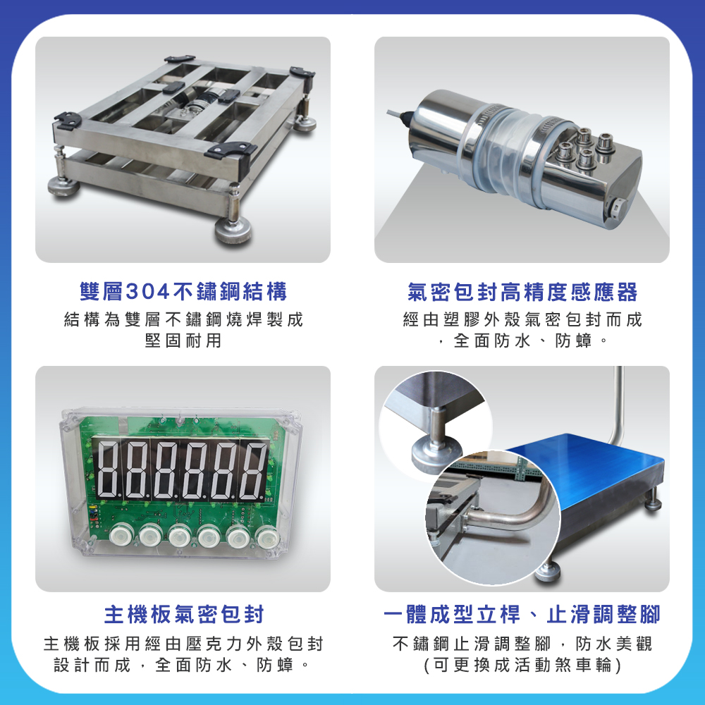 不鏽鋼防水電子台秤主機板、感應器防水秤重全部密封包封,增強防水、防塵、防蟲……等功能 ,適用於化工廠、食品加工廠、有化工原理及潮濕的環境。