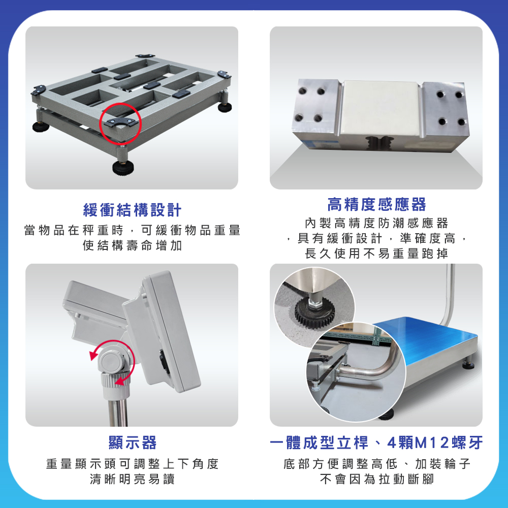 具有上下限報警、累計、簡易計數、扣重及鎖定重量模式,ㄇ型厚不鏽鋼鋼板製成,秤盤高度下拉包覆整體結構,防塵與防變形功能。