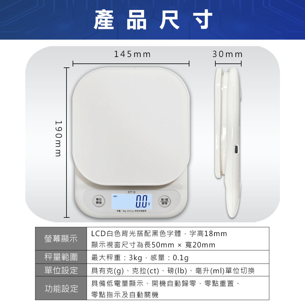 - 秤量範圍:最大秤重:3kg,感量:0.1g