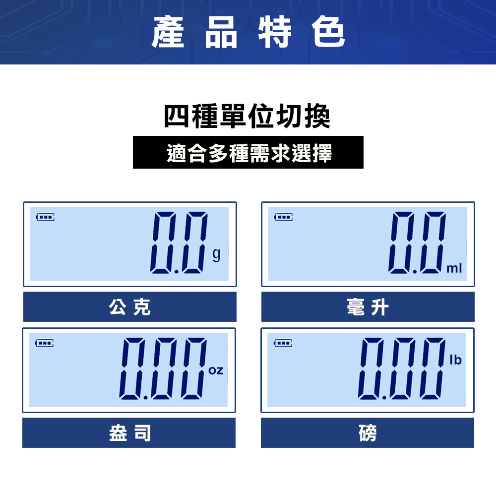 - 具有克(g)、克拉(ct)、磅(lb)、毫升(ml)多單位選擇。