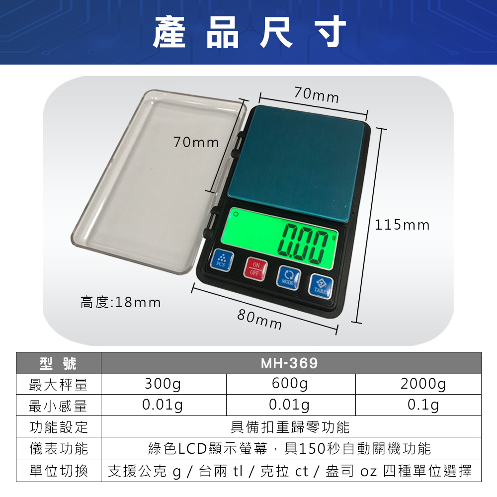 | 600g | 最大秤量:600g 感量:0.01g 外觀尺寸:115(長)*80(寬)*18(厚)mm 重量:87g |