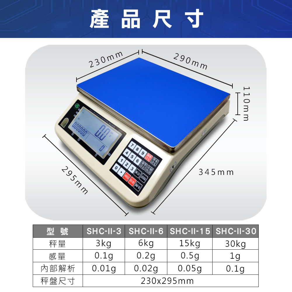 SHC-II 計數電子秤(3kg-30kg)具有1個大視窗內設3個小視窗的特色,專為需要計數和秤重設計的一款計數計重電子秤,提供準確的計數與重量檢測,能有效提高工作效率。