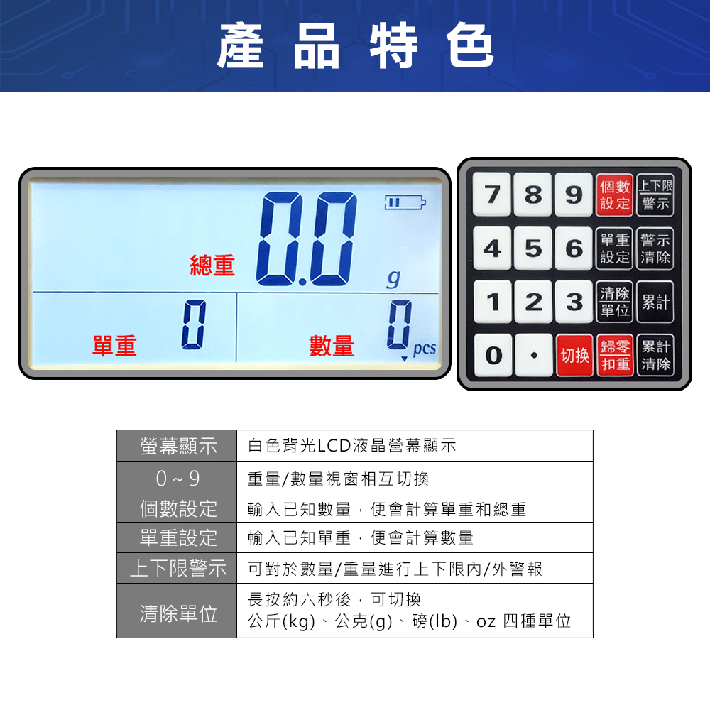 - 具有重量與數量的上下限警報功能,多種記憶功能,支援扣重與預扣重功能。