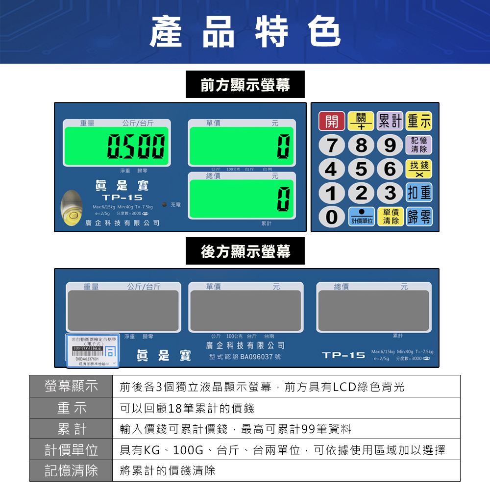 - 具有累計、找錢、重示、扣重、歸零、記憶清除、總價 並可累計20筆資料,記憶快速,方便使用。